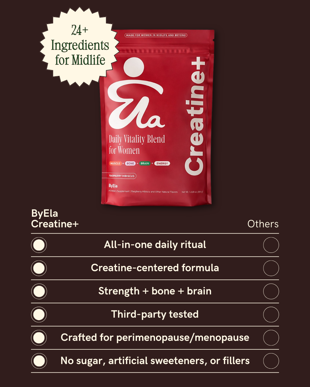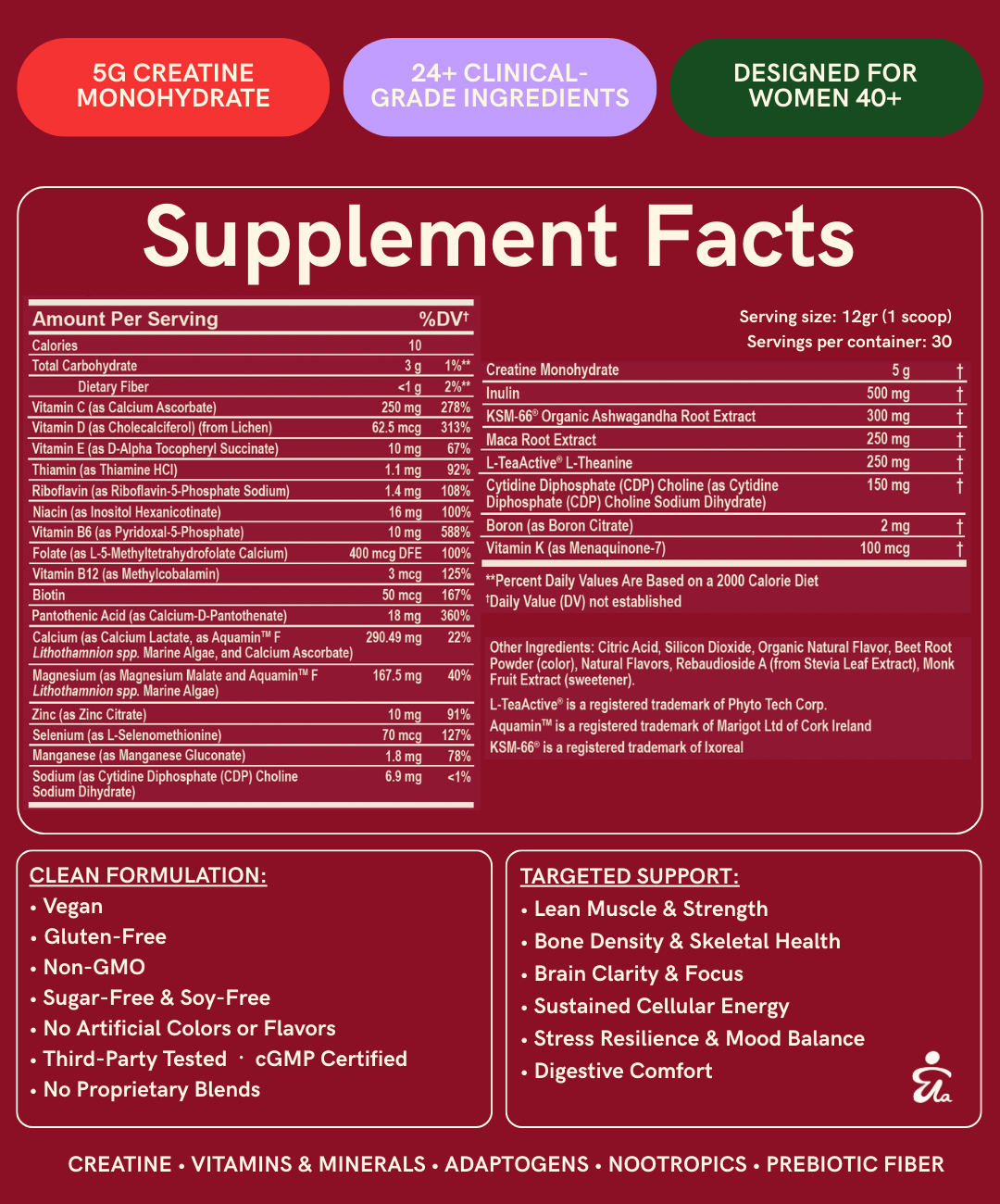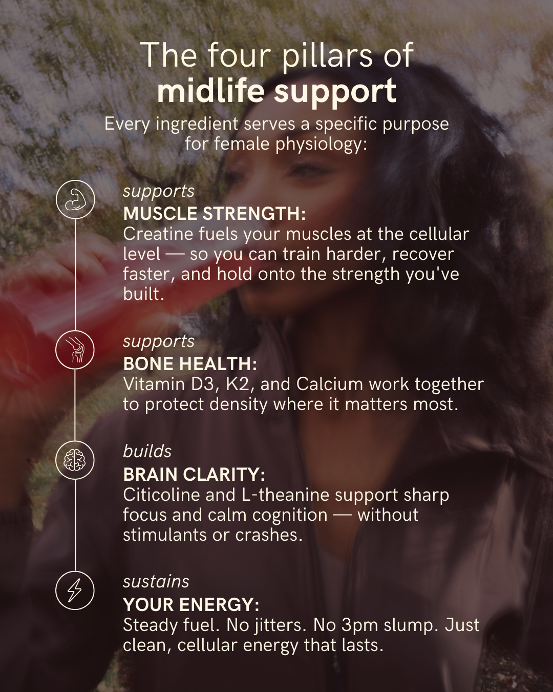 Creatine+ isn’t a “catch-all” multivitamin. It’s a targeted, intentional formula that includes essential nutrients for midlife women in their ideal, bioavailable forms and effective dosages. Many women choose Creatine+ instead of a multivitamin because it covers what truly matters for muscle, bone, brain, and energy — without unnecessary fillers.
