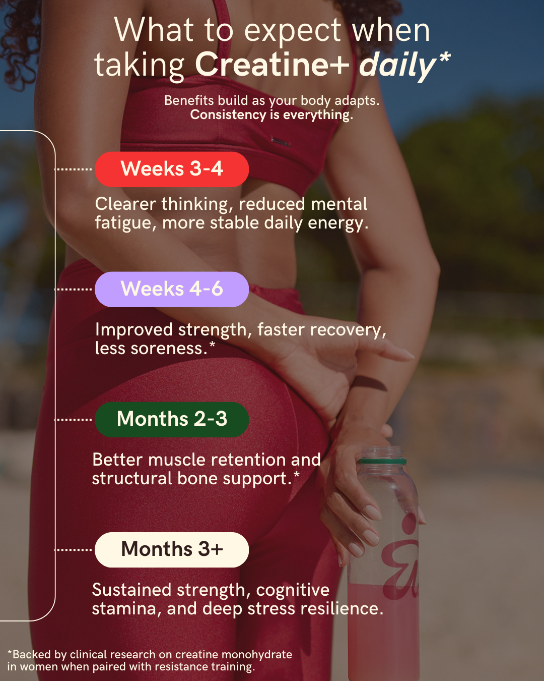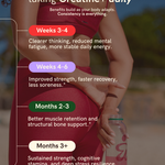 Deeper benefits such as strength, muscle quality, and bone-supporting effects build steadily over 3 months with daily use.